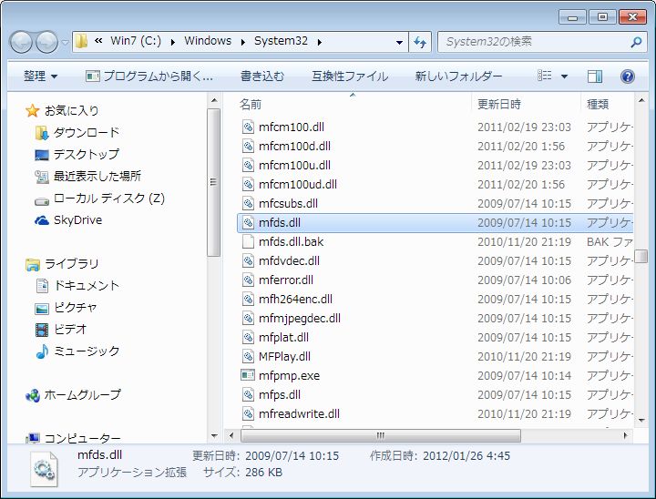 Windows 7SP1以前の「mfds.dll」を上記フォルダに保存。
