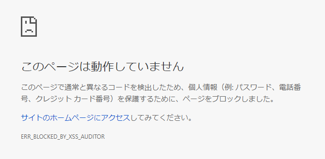 Chromeのバージョン56から、<script> や <iframe> タグが送信されると、「このページは動作していません」という ERR_BLOCKED_BY_XSS_AUDITOR エラーが出る場合がある。